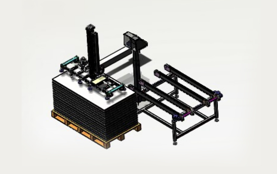 自動排版機的主要功能單元有:玻璃輸送定位系統(tǒng)、抓取行走系統(tǒng)、視覺檢測系統(tǒng)、電控系統(tǒng)等;通過以上功能單元,實現(xiàn)了將自動串焊機串焊好的電池串,按照工藝尺寸要求和排版方向順序自動排版鋪設到玻璃(EVA已經(jīng)鋪設)上,組成電池串陣列。玻璃/EVA通過傳輸線傳輸至指定位置,機械手抓取電池串實現(xiàn)CCD定位、自動旋轉(zhuǎn)、自動排版功能。設備通過同步帶傳輸與自動生產(chǎn)線對接,實現(xiàn)了自動流水作業(yè)。